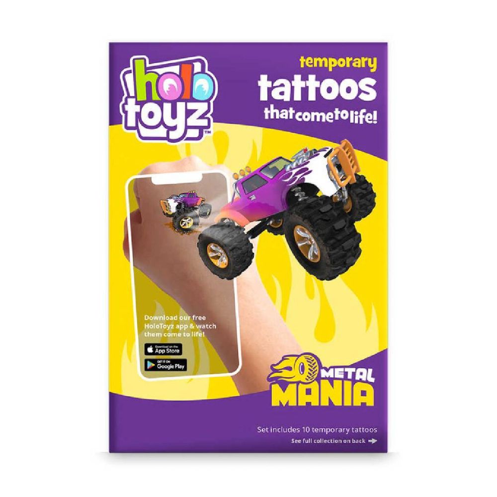 Τα προσωρινά τατουάζ Metal Mania είναι μια συλλογή από θηριώδη monster trucks και αγωνιστικά muscle cars που ζωντανεύουν και σου κόβουν την ανάσα, όταν σαρωθούν με τη δωρεάν εφαρμογή HoloToyz.