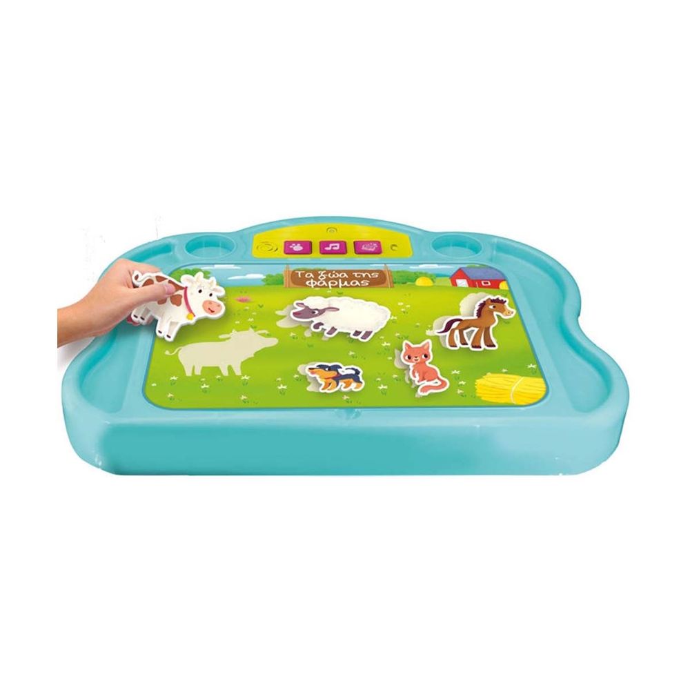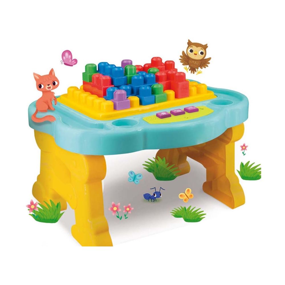 Ένα διασκεδαστικό θρανίο, σχεδιασμένο για παιδιά από ενός έτους με πολλές εκπαιδευτικές δραστηριότητες για την ολοκληρωμένη ανάπτυξή τους. Η συσκευασία περιέχει θρανίο για συναρμολόγηση, ηλεκτρονική συσκευή, βάση κατασκευής, 22 πλαστικά τουβλάκια, 8 ειδικά τουβλάκια, 7 ενσφηνώματα ζώων, 6 τεμάχια για αντιστοίχιση, βάση για το παιχνίδι της φάρμας, βιβλίο παραμυθιών, πίνακας που σβήνει, μαρκαδόρο που σβήνει και οδηγίες.
