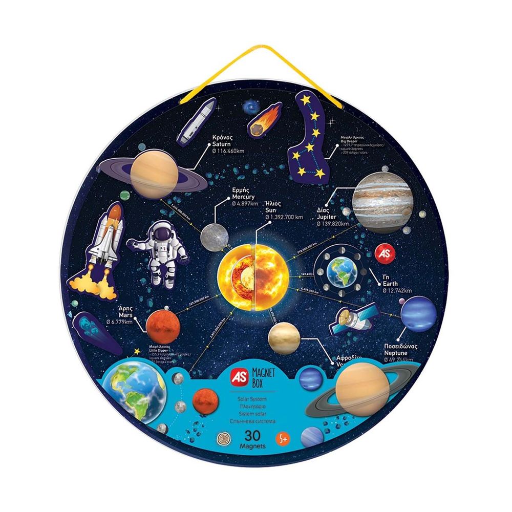 Με το AS Magnet Box Πλανητάριο το παιδί εξερευνεί & εξοικειώνεται με το ηλιακό σύστημα. Πλανήτες, αστερισμοί, δορυφόροι, αστροναύτες, παρέχονται σε μορφή μαγνητών για τοποθέτηση στο μαγνητικό ξύλινο χάρτη του ηλιακού συστήματος. Ιδανικό για δώρο για κάθε παιδί που ενδιαφέρεται να μάθει τι υπάρχει πέρα από τον δικό μας πλανήτη. Το πλανητάριο λειτουργεί επίσης και ως ένα εντυπωσιακό διακοσμητικό για το παιδικό δωμάτιο.