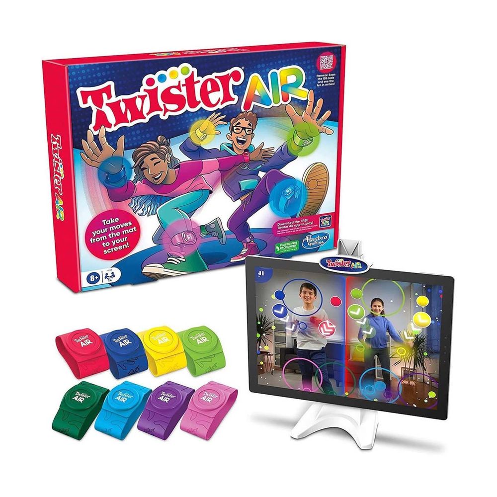 Κάνε κινήσεις από το χαλί στην οθόνη με το παιχνίδι Twister Air! Σε αυτό το παιχνίδι Twister με δυνατότητα εφαρμογής, το πάρτι μετακινείται στην έξυπνη συσκευή ενός παίκτη. Αυτό το διασκεδαστικό παιχνίδι πάρτι περιλαμβάνει 8 πολύχρωμες ζώνες Twister Air και μια βάση συσκευής που λειτουργεί για οποιοδήποτε smartphone ή tablet.