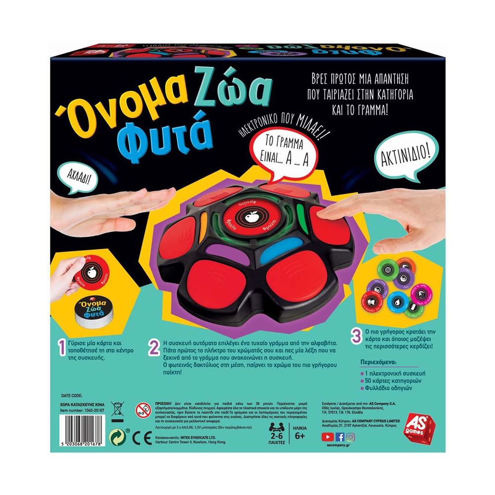 Το κλασικό παιχνίδι Όνομα Ζώα Φυτά σε ηλεκτρονική έκδοση με 50 διαφορετικά θέματα! Βρες πρώτος μία απάντηση που να ταιριάζει στην κατηγορία και το γράμμα και κέρδισε! Τι χρειάζεται να κάνεις; Τοποθέτησε μία κάρτα στο κέντρο της συσκευής. Η συσκευή επιλέγει αυτόματα ένα τυχαίο γράμμα από την αλφαβήτα. Πάτα πρώτος το πλήκτρο του χρώματός σου και πες μία σχετική λέξη με το θέμα της κάρτας, που να ξεκινά από το γράμμα που ανακοίνωσε η συσκευή.