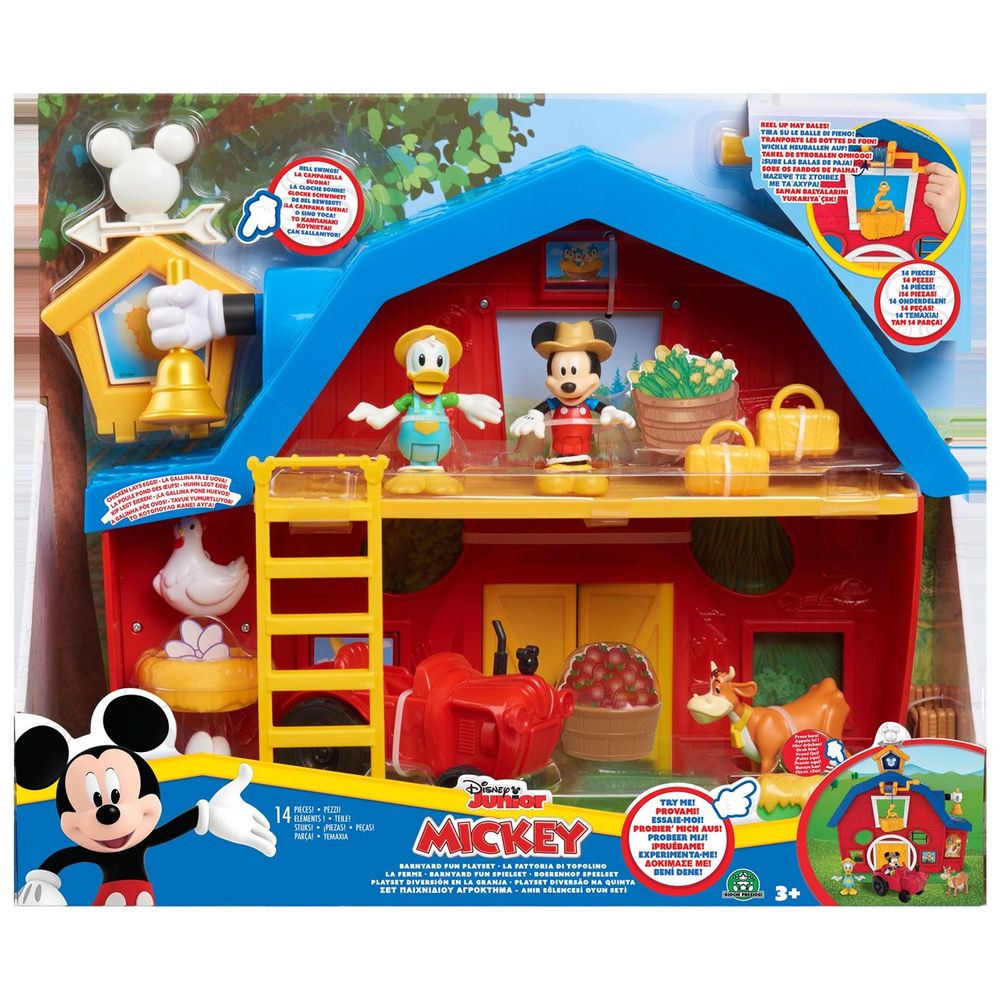 Ο Mickey και ο Donald δε σταματούν τη δουλειά στο αγρόκτημα! Θα λατρέψεις το να δημιουργήσεις τις δικές σου περιπέτειες με αυτό το σετ παιχνιδιού δύο όψεων. Πάτησε το κουμπί της στοίβας άχυρου για να ακούσεις τον Μίκυ να μιλάει και το τραγούδι "Old McDonald". Χτύπησε το κουδούνι στο πλάι του αχυρώνα όταν έρθει η ώρα για τους αγρότες Μίκυ Μάους και Ντόναλντ Ντακ να ξεκινήσουν τη μέρα τους. Το κουδούνι πραγματικά κουνιέται και το παιχνίδι ξεκινάει!