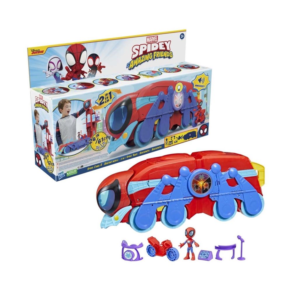 Αυτό το σετ παιχνιδιού 2 σε 1, με φώτα και ήχους, μετατρέπεται από παιχνίδι κυλιόμενου αυτοκινήτου μεγάλης κλίμακας σε πύργο HQ ύψους 2 ποδιών! Τράβηξε έξω τη ράμπα και η φιγούρα δράσης Spidey μπορεί να επιταχύνει τη μοτοσικλέτα που περιλαμβάνεται! Ταυτόχρονα, τα παιδιά μπορούν να βγάλουν τον προφυλακτήρα ιστού για να νικήσουν τους κακούς! Αυτά τα διαδραστικά παιχνίδια είναι εμπνευσμένα από την προσχολική παράσταση Marvel.
