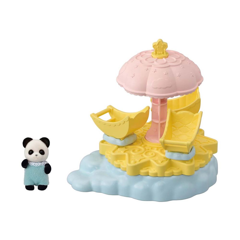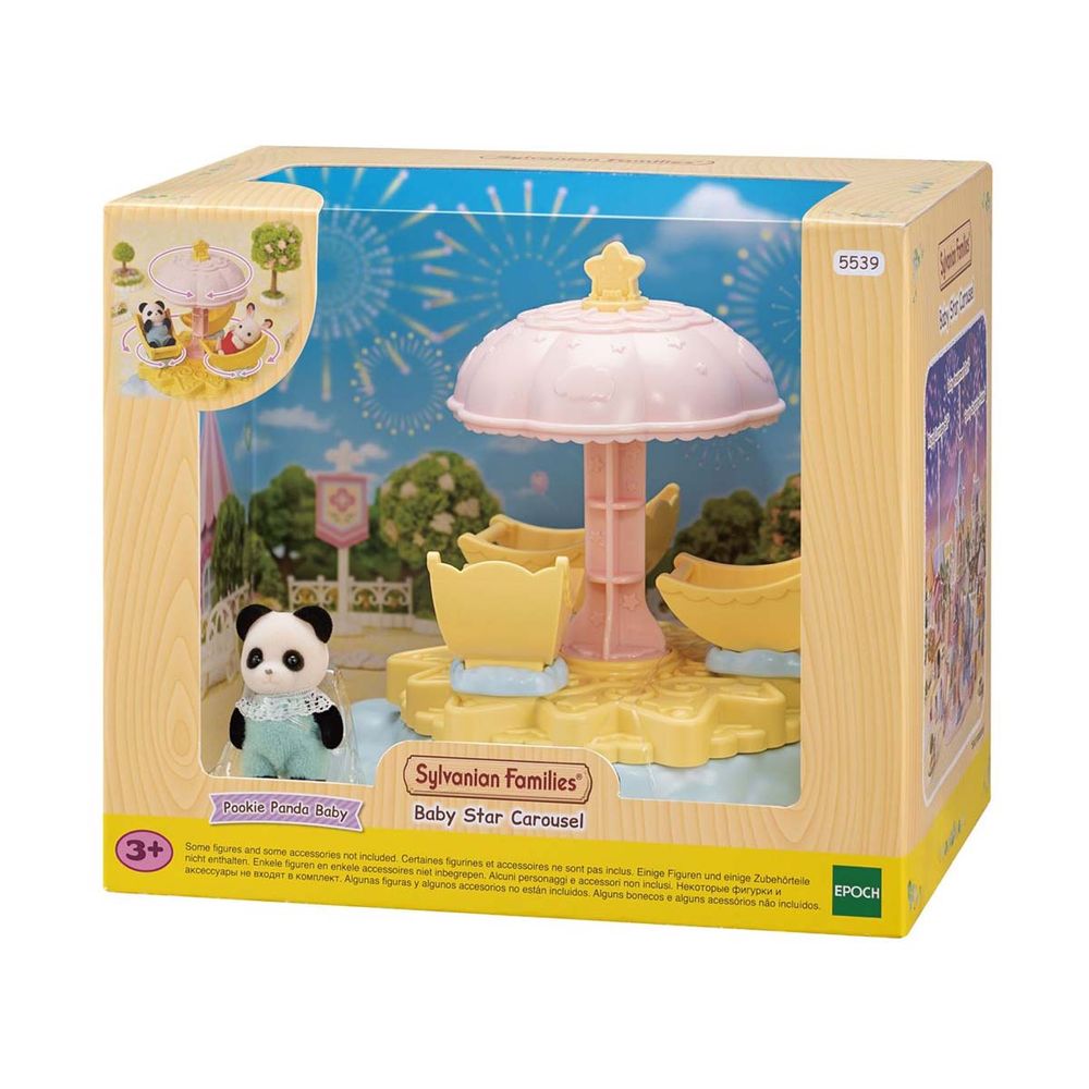 Το αστεράκι καρουζέλ έχει καθίσματα σε σχήμα φεγγαριού που περιστρέφονται γύρω γύρω από την ροζ ομπρέλα ενώ διαθέτει τρία καθίσματα για τα μωρά των Sylvanians. Ακόμα, αυτό το σετ περιλμαβάνει μια φιγούρα του μωρού Panda.