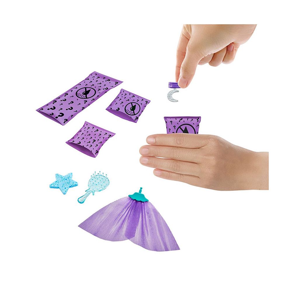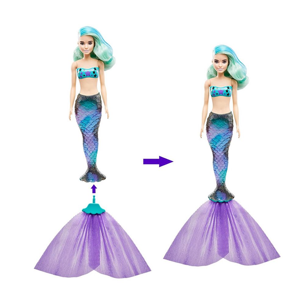 Οι κούκλες Barbie Color Reveal έχουν 7 διασκεδαστικές εκπλήξεις! Μια υπέροχη κούκλα-γοργόνα, η εμφάνιση όμως κάθε κούκλας της σειράς είναι ένα μυστήριο μέχρι να αποκαλυφθεί. Η συσκευασία είναι μέρος του παιχνιδιού. Τράβηξε για να βγάλεις το εξωτερικό κάλυμμα και να αποκαλύψεις έναν διαφανή κύλινδρο. Στο εσωτερικό θα βρεις μία κούκλα Color Reveal σε μεταλλικό τιρκουάζ χρώμα και τέσσερα σακουλάκια που κρύβουν εκπλήξεις!