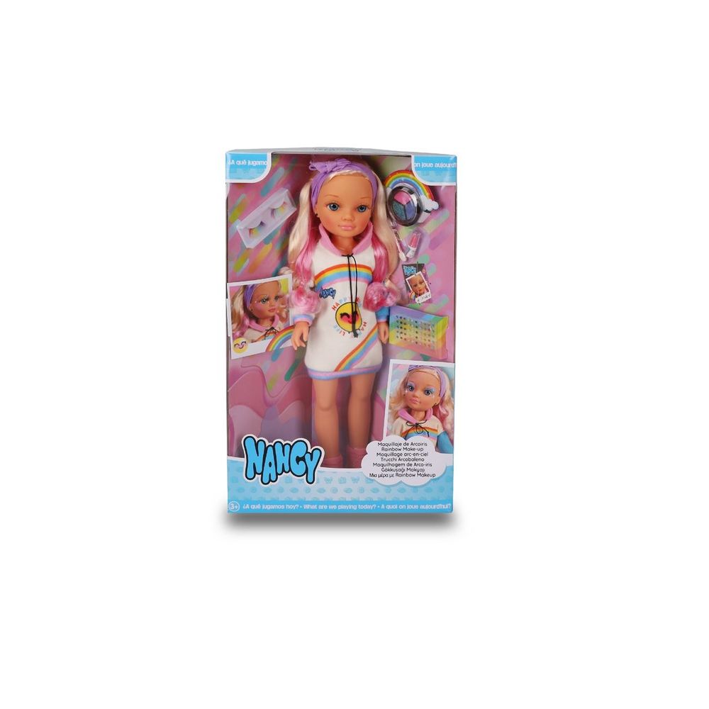 Nancy, τι παίζουμε σήμερα; Σήμερα κάνουμε μακιγιάζ στα χρώματα του ουράνιου τόξου! Κούκλα Nancy με υπέροχο φόρεμα - φούτερ και πολλά αξεσουάρ για να της κάνεις το μακιγιάζ. Φόρεσε της τις βλεφαρίδες στα χρώματα του ουράνιου τόξου, διακόσμησε τη με στρασάκια, πρόσθεσε λίγη σκιά ματιών, κραγιόν και έτοιμη στην στιγμή!