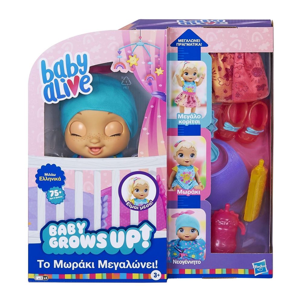 Η κούκλα Baby Alive Baby Grows Up μεταμορφώνεται από νεογέννητο μωράκι σε χαριτωμένο κοριτσάκι. Για την ακρίβεια η υπέροχη αυτή κουκλίτσα, μεγαλώνει κατά 4 ίντσες με τη φροντίδα του παιδιού σου και λέει την πρώτη της λέξη. Τα παιδιά θα λατρέψουν επίσης τα 8 αξεσουάρ της κούκλας με διάφορα χαρούμενα θέματα. Όταν την ταΐσεις για πρώτη φορά, ανοίγει τα ματάκια της και φαίνεται το χρώμα τους.