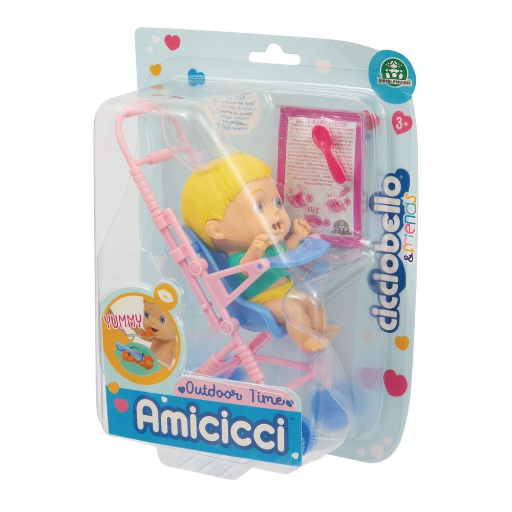 Τα Cicciobello Amicicci είναι τα μικρά, χαριτωμένα σου φιλαράκια! Σετ που περιέχει 1 καροτσάκι, 1 σετ φαγητού (1 συσκευασία για φαγητό μωρού, κουτάλι) και κούκλα-μωρό ύψους 11 cm με ευέλικτο και μαλακό σώμα από σιλικόνη. Πίεσε το προσωπάκι του μωρού για να κάνει διαφορετικές εκφράσεις! Βάλε το Amicicci σου για βόλτα στο καροτσάκι του και μετά τάισε το με το φαγητό που περιέχεται. Βγάλε του το μπλουζάκι και άλλαξε του την πάνα! Τέλος, περιέχει: 1 αποσπώμενη πάνα και 1 αποσπώμενη μπλούζα.