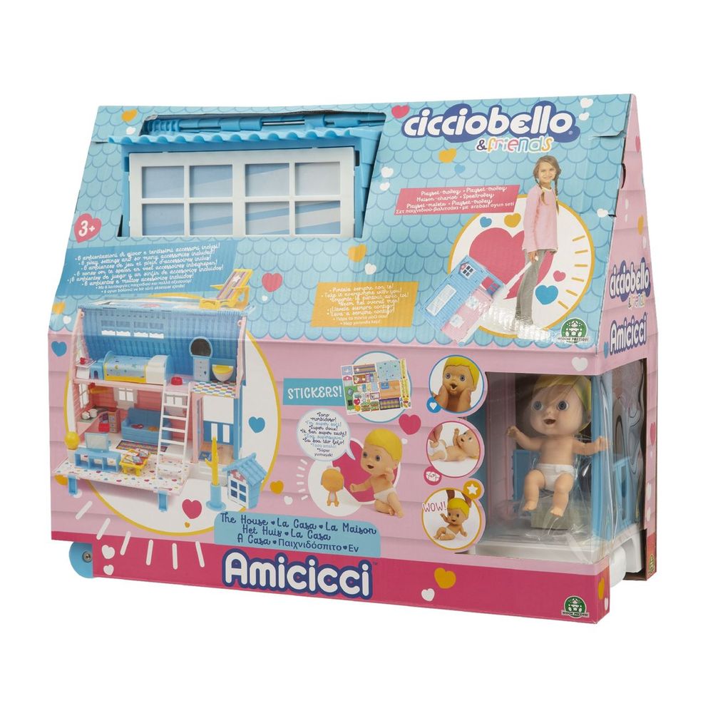 Τα Cicciobello Amicicci Φιλαράκια έχουν το δικό τους σπίτι! Μεγάλο παιχνιδόσπιτο με 3 επίπεδα για παιχνίδι με τις κούκλες-μωρά Cicciobello Amicicci. Διαθέτει πολλά δωμάτια για ανακαλύψη και παιχνίδι όπως καθιστικό, υπνοδωμάτιο, μπάνιο, ταράτσα, κήπο. Περιλαμβάνονται πολλά αξεσουάρ και αυτοκόλλητα για διακόσμηση! Περιέχει 1 κούκλα μωρό Amicicci & το ζωάκι του. Το παιχνίδι γίνεται βαλιτσάκι με ροδάκια για να το παίρνει το παιδί παντού μαζί του!