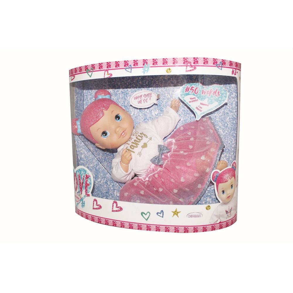 H κούκλα #LOVE 40 cm μιλάει Ελληνικά! Απαλή στο σώμα, με glitter στο κεφάλι. Θα την ακούσεις να σου λέει 50 λέξεις όπως μαμά σε αγαπώ, μπαμπά, γεια σου… και άλλες πολλές! Απαιτούνται 3 LR44 μπαταρίες (περιλαμβάνονται).
