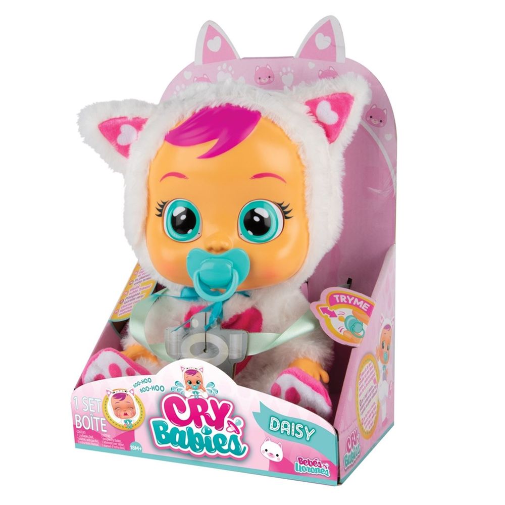 Γνώρισε τη Daisy, το αγαπημένο Κλαψουλίνι από την Κοιλάδα των Μπιμπερό! Φορώντας τις αγαπημένες της πιτζαμούλες με τα ροζ αυτάκια με καρδούλες, θυμίζει μία πανέμορφη γατούλα! Κάθε κούκλα Cry Babies έρχεται με πολύχρωμες πιτζάμες που θυμίζουν ζωάκια και 1 πιπίλα. Απλά πρόσθεσε νερό και θα κλάψει με πραγματικά δάκρυα! Αν αφαιρέσεις την πιπίλα τους, κλαίνε με αληθινά δάκρυα και κάνουν ήχους σαν αληθινό μωρό! Δώσε τους την πιπίλα τους και φρόντισέ τα για να σταματήσουν να κλαίνε.