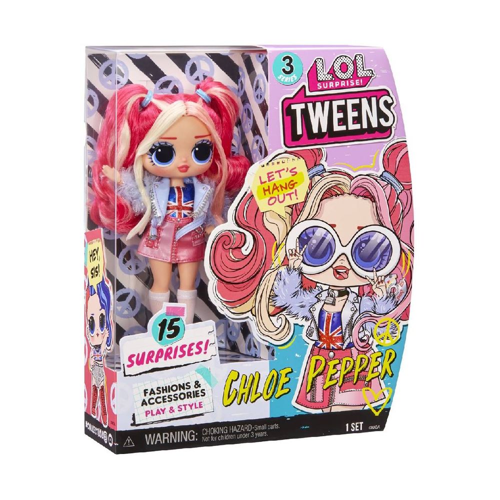 Νέα κούκλα L.O.L. Surprise! Tweens! Μοναδικές κούκλες μόδας για μοναδικές στυλάτες εκπλήξεις! Γνώρισε την Chloe Pepper και ετοιμάσου για την πιο μοδάτη unboxing εμπειρία. 15 εκπλήξεις σε περιμένουν να τις ανακαλύψεις! Με επαναχρησιμοποιούμενη συσκευασία που λειτουργεί για εξτρα παιχνίδι. Το σετ περιλαμβάνει κούκλα 15cm, αξεσουάρ, χτενάκι, τσαντούλα, βάση στήριξης κούκλας, αυτοκόλλητα.