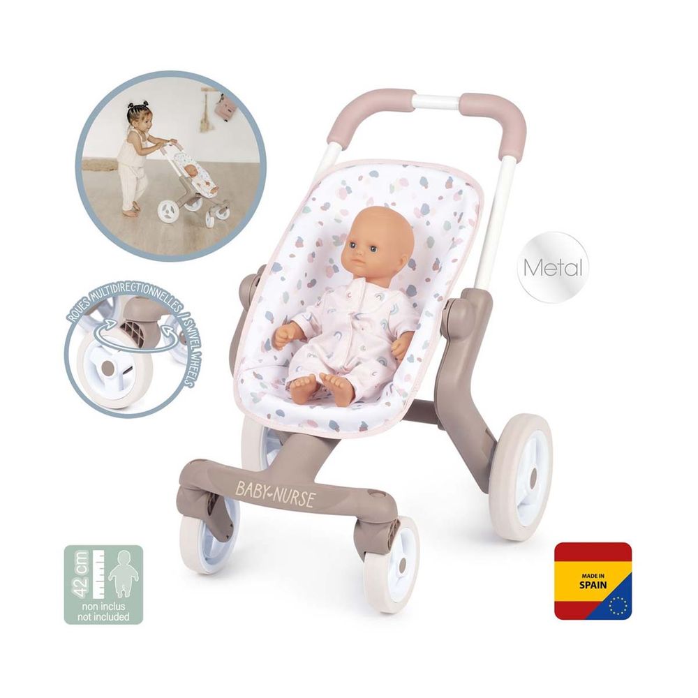 Καροτσάκι κούκλας Baby Nurse 4 τροχών για κούκλες μωρών έως 42cm. Διαθέτει κάθισμα με ύφασμα και εργονομική χειρολαβή. Η κούκλα δεν περιλαμβάνεται.