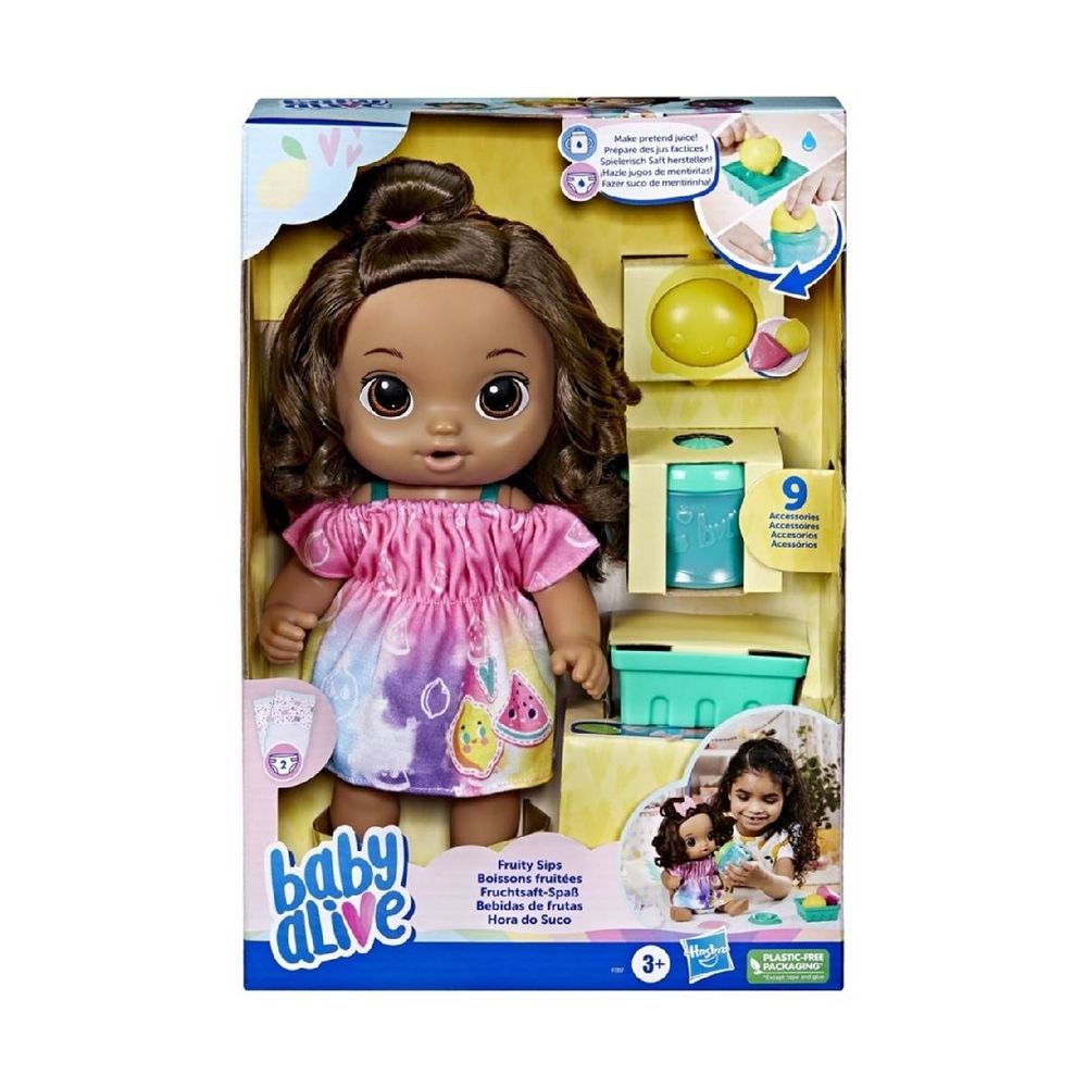 Με την κούκλα Baby Alive Fruity Sips, μπορείς να χρησιμοποιήσεις τον αποχυμωτή και το αξεσουάρ για να ταΐσεις την κούκλα Baby Alive σου! Αυτή η κούκλα συνοδεύεται από αξεσουάρ Baby Alive, όπως ένας αποχυμωτής με 2 πλαστικά φρούτα (λεμόνι και καρπούζι) που μπορείς να τα βυθίσεις στο νερό και να τα στύψεις. Μετά το τάισμα ακολουθεί η αλλαγή της πάνας, όπως στα κανονικά μωρά.