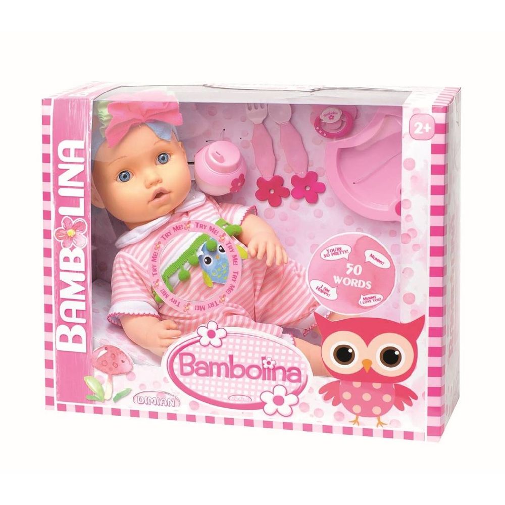 Η Bambolina μιλάει Ελληνικά! Πίεσε την κοιλίτσα της για να ακούσεις 50 διαφορετικές λέξεις! Θα ακούσεις τις πρώτες της λέξεις όπως, μαμά, μπαμπά, γεια σου… και άλλες πολλές! Είναι έτοιμη για αγκαλιές και φαγητό! Είναι ντυμένη με ένα απαλό φoρμάκι, ιδανικό για μικρές ηλικίες!