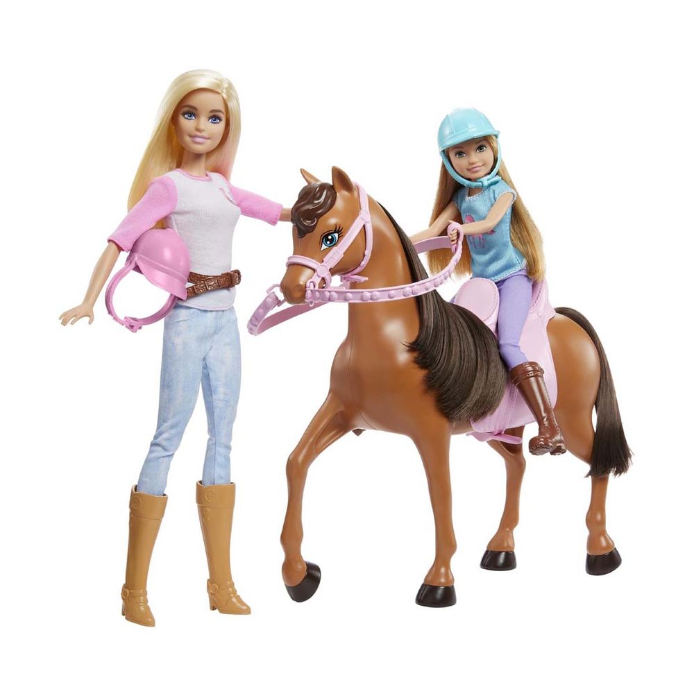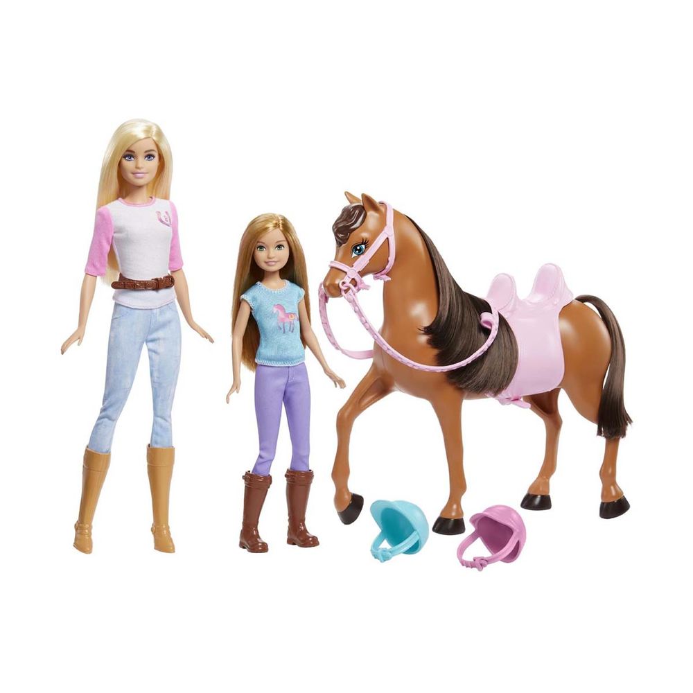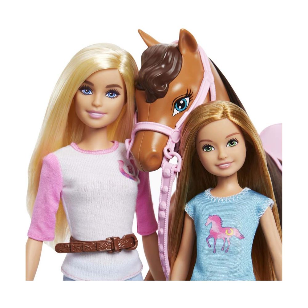 Ετοιμάσου να καλπάσεις στην περιπέτεια με την Barbie, τη μικρότερη αδερφή της, Stacie και το αξιολάτρευτο άλογό τους. Κάθε κούκλα φοράει ρούχα και μπότες για ιππασία και ασορτί κράνος.