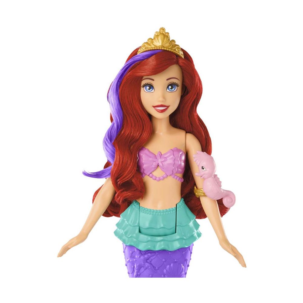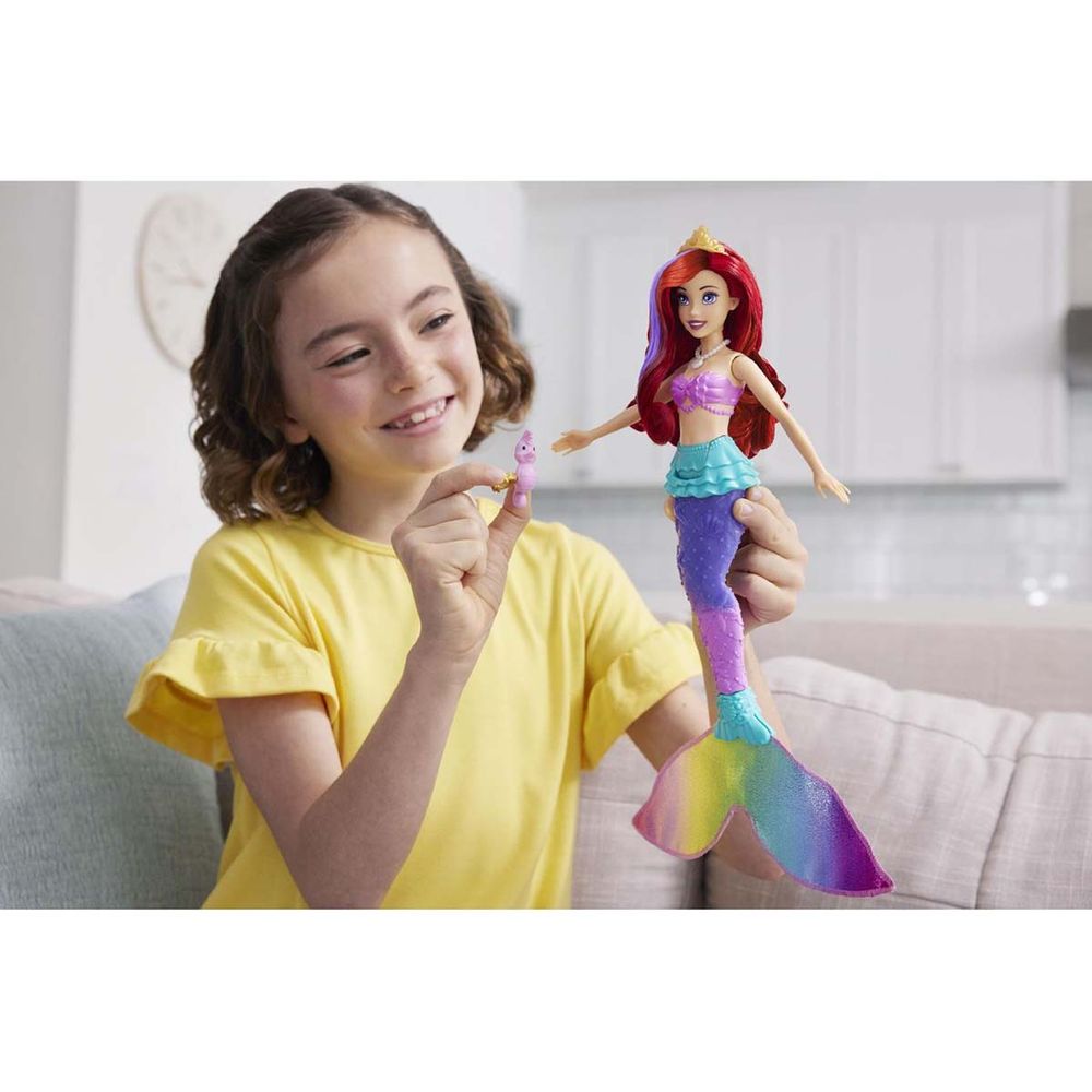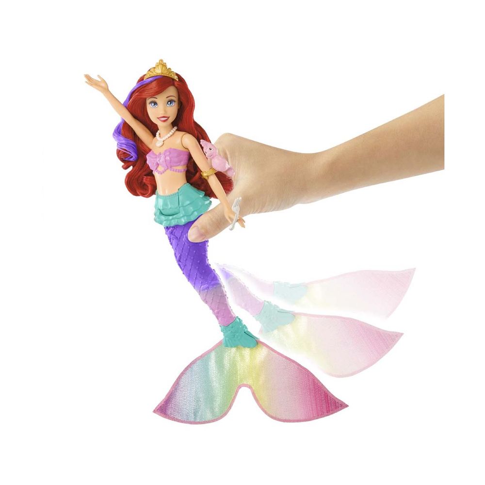Εμπνευσμένη από τη Μικρή Γοργόνα της Disney, αυτή η κούκλα γοργόνα εντυπωσιάζει με το κολύμπι και την αλλαγή χρωμάτων. Πίεσε τους γοφούς της κούκλας για να κάνεις την ουρά της γοργόνας να κινείται πάνω κάτω, σαν να κολυμπάει πραγματικά. Η κούκλα αλλάζει χρώμα στα μαλλιά και στην ουρά της βουτώντας την σε νερό.