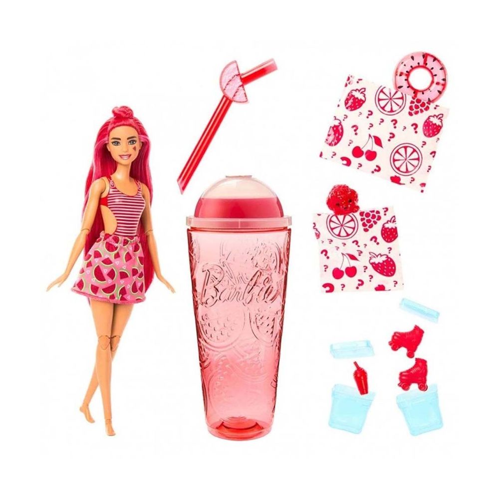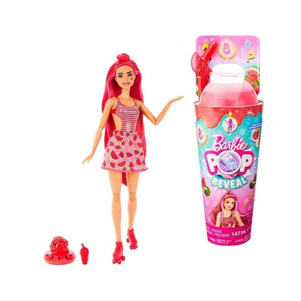 Οι κούκλες Barbie Pop Reveal προσφέρουν μια εμπειρία unboxing! Ξετύλιξε τη συσκευασία εμπνευσμένη από το ποτήρι ποτού για να βρείς την κούκλα με άρωμα Watermelon Crush στη σειρά Fruit. Άνοιξε το καπάκι και αφαίρεσε τα σακουλάκια έκπληξη.