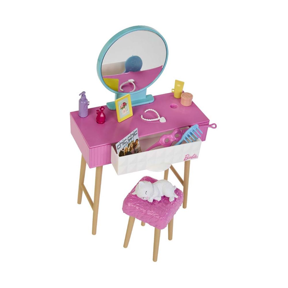 H Barbie έχει όσα χρειάζεται σε αυτό το υπνοδωμάτιο για να χαλαρώσει και να κοιμηθεί ή να ετοιμαστεί το πρωί! Με κρεβάτι, κομοδίνο, τουαλέτα ομορφιάς και πολλά θεματικά αξεσουάρ, τα παιδιά μπορούν να φανταστούν καθημερινές ιστορίες.