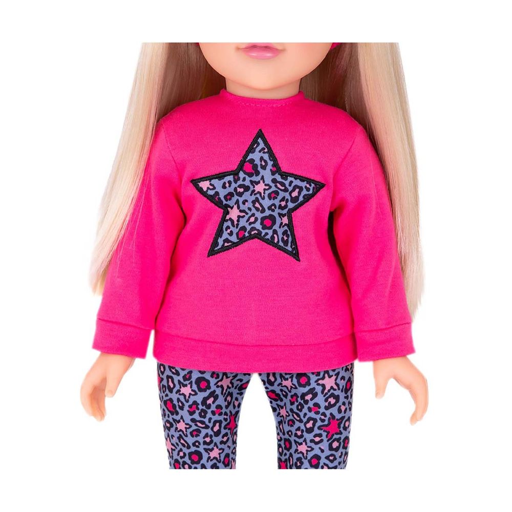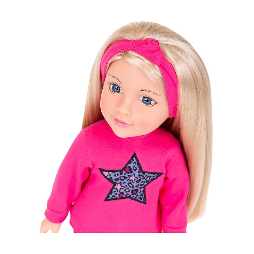 Design a Friend κούκλα Emmie 46 cm. Η Emmie, με τα μακριά, ξανθά μαλλιά και τα καταγάλανα μάτια, ξεχωρίζει σε κάθε της εμφάνιση. Είναι ντυμένη casual, για να είναι πάντα άνετη και μοδάτη. Η Emmie φοράει μακρυμάντικο ροζ φούτερ με απλικέ αστέρι λεοπάρ, κολάν ζέρσει λεοπάρ, ροζ κορδέλα στα μαλλιά και ροζ παπούτσια. Οι κούκλες Design a Friend έχουν σχεδιαστεί για όλα τα νέα κορίτσια που λατρεύουν τη μόδα.