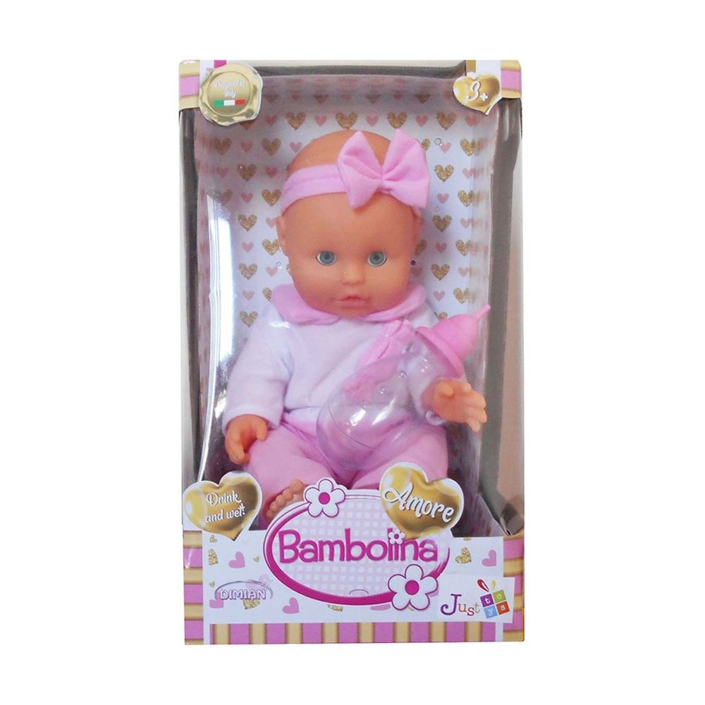 Bambolina με ανθρώπινες συνήθειες! Είναι ντυμένη με ένα απαλό φoρμάκι, ιδανικό για μικρές ηλικίες! Τάισε την με το μπιμπερό για να πιεί το γαλατάκι της! Βάλε την στο γιογιό της και θα κάνει πιπί!