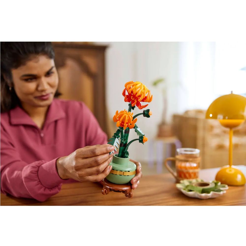 Χάρισε στον εαυτό σου ή σε κάποιον αγαπημένο το σετ κατασκευής LEGO® Icons Χρυσάνθεμα για ενήλικες. Αυτή η όμορφη LEGO αναδημιουργία με αρθρωτά φύλλα και πέταλα απεικονίζει τα πορτοκαλί λουλούδια σε διάφορα στάδια ανάπτυξης, μέσα σε μια παστέλ πράσινη γλάστρα με χρυσή ταινία και βάση με εφέ ξύλου. Άφησε ελεύθερη τη δημιουργικότητα φτιάχνοντας ένα διαχρονικό διακοσμητικό και μετά επίδειξέ το.