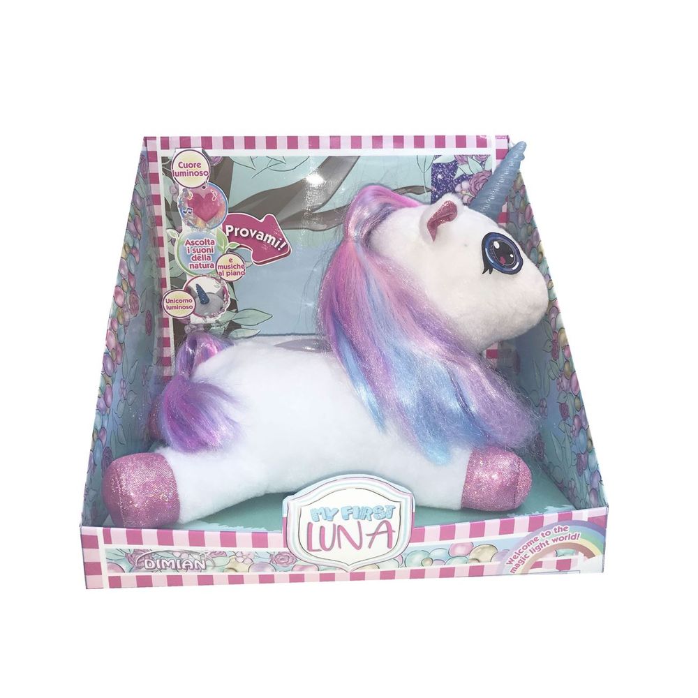 Luna μαλακή μονόκερος με κέρατο που φωτίζει, με υπέροχα χρώματα. Έχει μακριά μαλλιά σαν ουράνιο τόξο. Περιλαμβάνει ήχους.