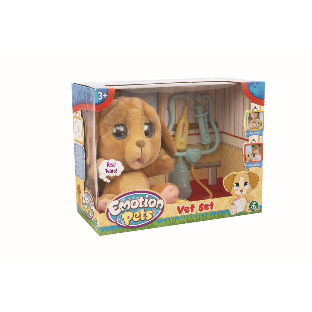Τα Εmotion Pets είναι τα γλυκά, διαδραστικά λούτρινα κουταβάκια που αναζητούν την φροντίδα σου! Με όμορφα μεγάλα ματάκια και σούπερ απαλό τρίχωμα! Πίνουν αληθινά νεράκι από το μιμπερό τους και μετά κλαίνει με αληθινά δάκρυα γιατί αναζητούν φροντίδα. Στο σετ Κτηνιάτρου θα βρείτε ένα Emotion Pet Λούτρινο Κουταβάκι σε αποκλειστικό καφέ χρώμα που κλαίει αληθινά όταν του δίνετε το νερό με το μπιμπερό του. Μαζί θα βρεις και αξεσουάρ κτηνιάτρου. Δεν απαιτούνται μπαταρίες.