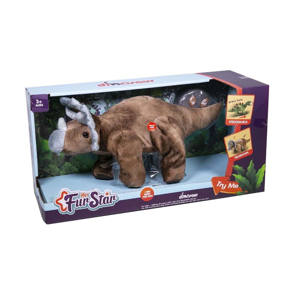 Αυτός ο λούτρινος τρικεράτοπας που περπατάει και μιλάει θα γίνει ο καλύτερός σου φίλος. Ο δεινόσαυρος περπατάει και βρυχάτε είτε πατώντας τον στο πλάι είτε επιλέγοντάς το από το χειριστήριο. Για τη χρήση του δεινοσαύρου απαιτούνται μπαταρίες (περιλαμβάνονται) και για τη χρήση του χειριστηρίου απαιτούνται 2xAA μπαταρίες (δεν περιλαμβάνονται).