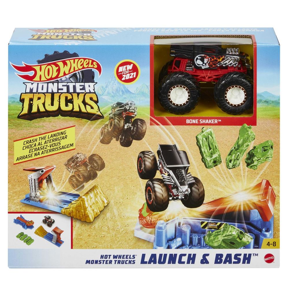 Ολοκληρωμένο σετ παιχνιδιού! Τα παιδιά χρησιμοποιούν το εκτοξευτή για να στοχεύσουν το όχημα Monster Truck κλίμακας 1:64 στη ζώνη προσγείωσης για συναρπαστική δράση. Η πλατφόρμα είναι γεμάτη με τέσσερα σπασμένα αυτοκίνητα και όταν το Monster Truck Bone Shaker χτυπήσει σωστά το σημείο, η σύγκρουση είναι επική! Τα παιδιά μπορούν να τοποθετήσουν ξανά τα αυτοκίνητα στην πλατφόρμα και να εκτελέσουν το κόλπο ξανά και ξανά για ώρες δράσης και διασκέδασης.