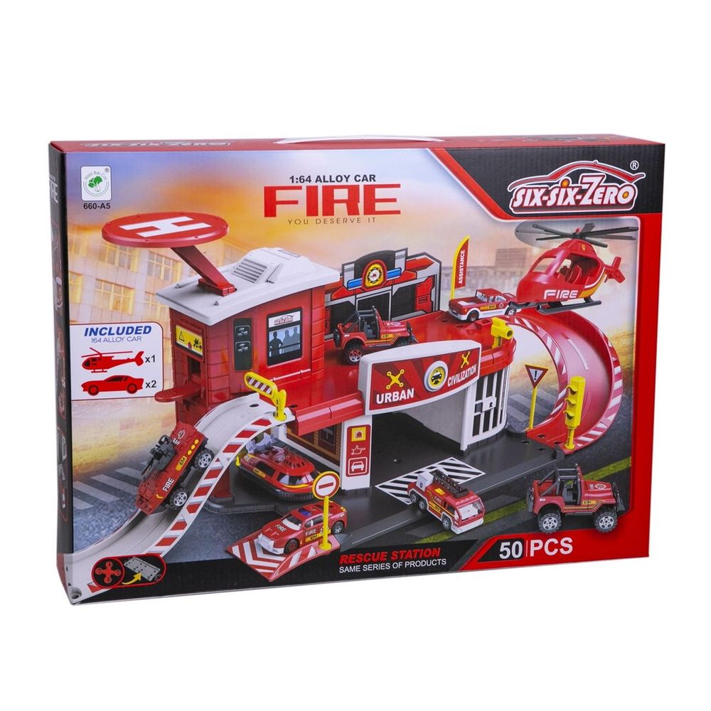 Σετ γκαράζ πυροσβεστική που περιλαμβάνει 2 οχήματα και 1 ελικόπτερο κλίμακας 1:64. .Η συσκευασία περιλαμβάνει συνολικά 50 τεμάχια, για να κατασκευάσεις το γκαράζ καθώς και πολλά οδικά σήματα. Με λαβή χειρός για εύκολη μεταφορά.