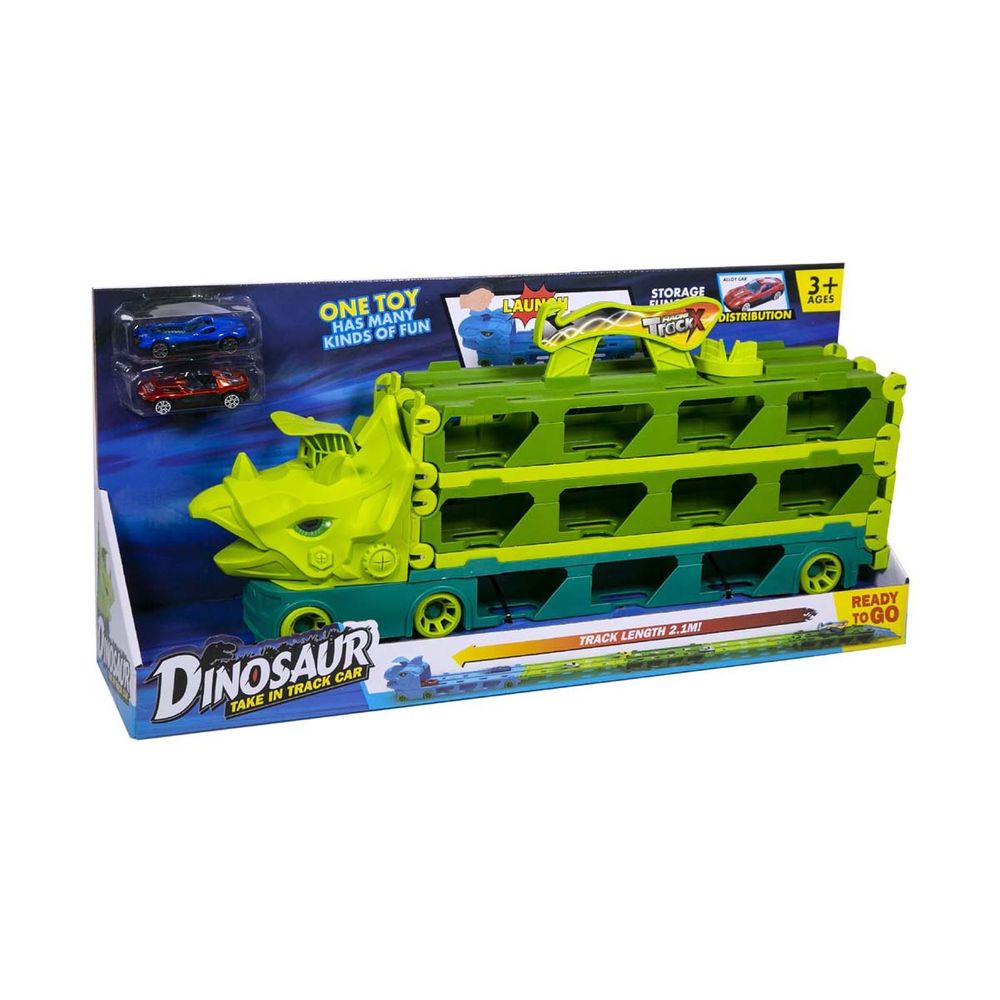 Νταλίκα δεινόσαυρος με χερούλι, μήκους 49 cm. και δύο αυτοκινητάκια 7 cm. Η νταλίκα μεταμορφώνεται σε μία εκπληκτική πίστα μήκους 2.1 μέτρα για να ζήσεις τις απόλυτες κόντρες. Τα μικρά παράθυρα στη νταλίκα δίνουν τη δυνατότητα μεταφοράς πάνω από 20 αυτοκινητάκια και με το εργονομικό χερούλι μπορείς να το έχεις πάντα μαζί σου. Αυτό το dinosaur take in truck car προσφέρει μια μοναδική και συναρπαστική εμπειρία παιχνιδιού.