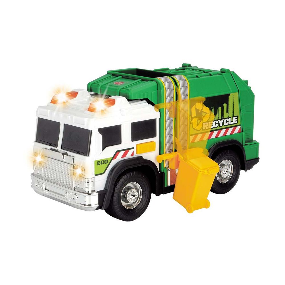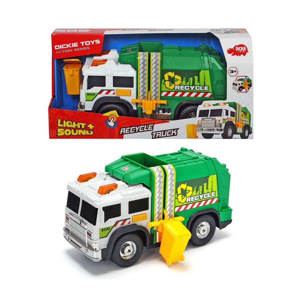 Dickie όχημα ανακύκλωσης με ήχο και φως. Ο κάδος ανεβοκατεβαίνει, για να μπορεί να συλλέγει τα απορρίματα προς ανακύκλωση. Απαιτούνται 2 μπαταρίες 1.5V R6 για τη χρήση του (περιλαμβάνονται). Μήκος οχήματος 30 cm.