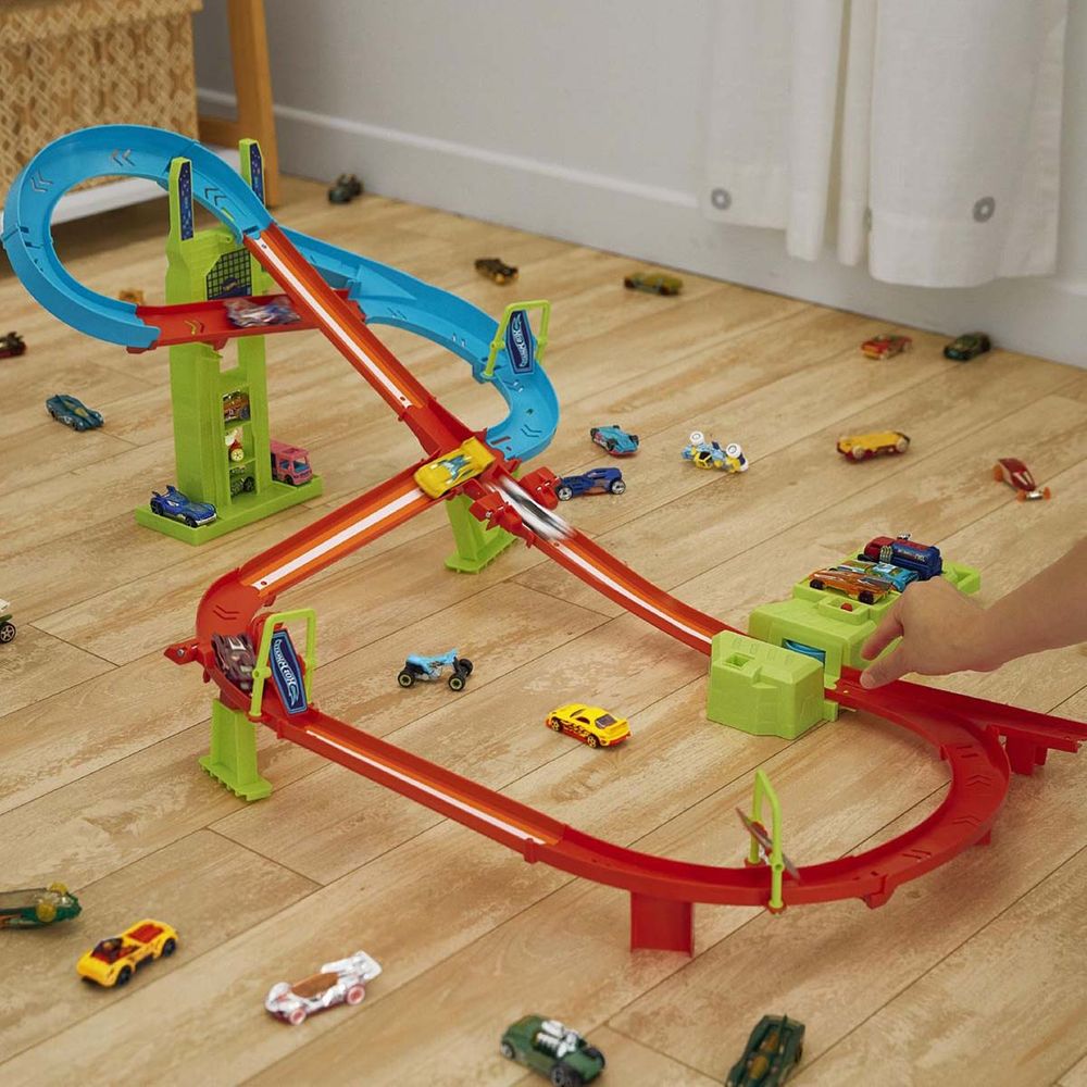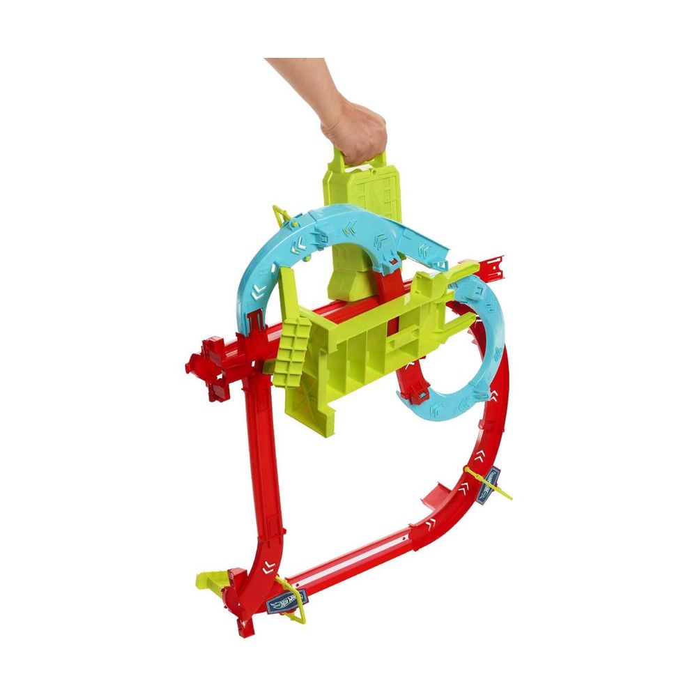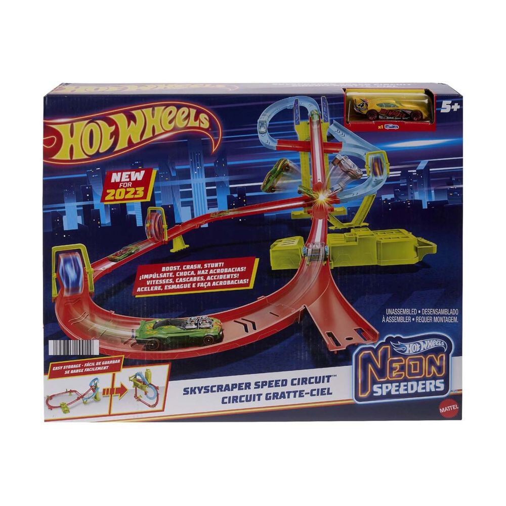 Τρέξε γύρω από έναν ουρανοξύστη στην πίστα Hot Wheels Neon Speeders! Τα παιδιά φορτώνουν το αυτοκίνητό τους Hot Wheels στον μηχανοκίνητο εκτοξευτή που εκτοξεύει αυτοκινητάκια στη διαδρομή και γύρω από έναν ουρανοξύστη. Καθώς τα αυτοκινητάκια επιταχύνουν στην πίστα, δημιουργείται ένα εφέ που μοιάζει σαν να αναβοσβήνουν φώτα. Περιλαμβάνει ένα αυτοκινητάκι Hot Wheels.