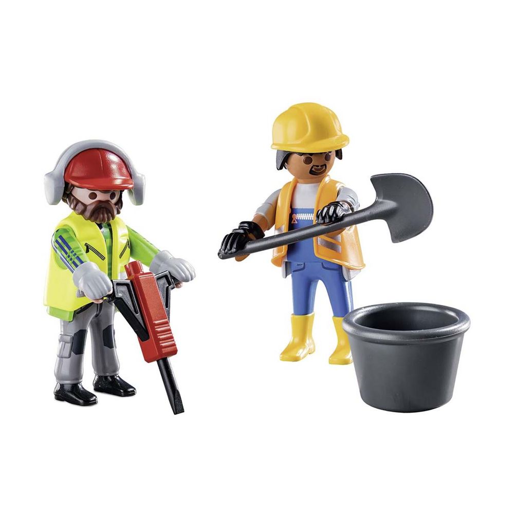 Σετ 2 φιγούρες εργάτες οικοδομών PLAYMOBIL®, με αερόσφυρα, φτυάρι και κάδο, για ατελείωτο παιχνίδι.