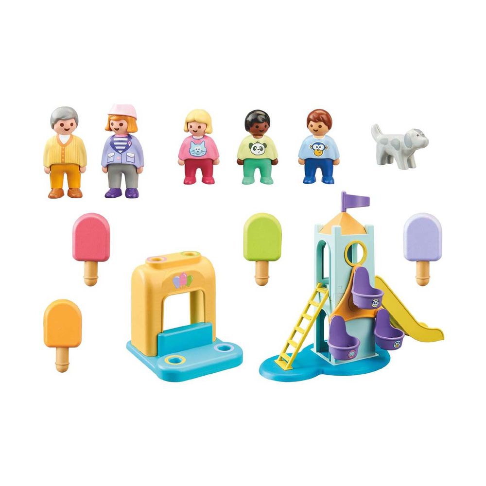 Στην παιδική χαρά της Playmobil 1.2.3 η διασκέδαση δεν τελειώνει ποτέ! Τα παιδιά θα ανακαλύψουν πολλά και διαφορετικά παιχνίδια. Πρώτα θα επισκεφθούν τη ρόδα του λούνα παρκ που περιστρέφεται γυρνώντας την ειδική λαβή. Μετά είναι η ώρα για τσουλήθρα. Εδώ υπάρχει μία ξεχωριστή λειτουργία: εάν τοποθετήσεις μία φιγούρα πάνω στην επίπεδη πλατφόρμα στην αρχή της τσουλήθρας, τότε αυτή αρχίζει να μετακινείται προς την τσουλήθρα μέχρι να γλιστρήσει από μόνη της προς τα κάτω.