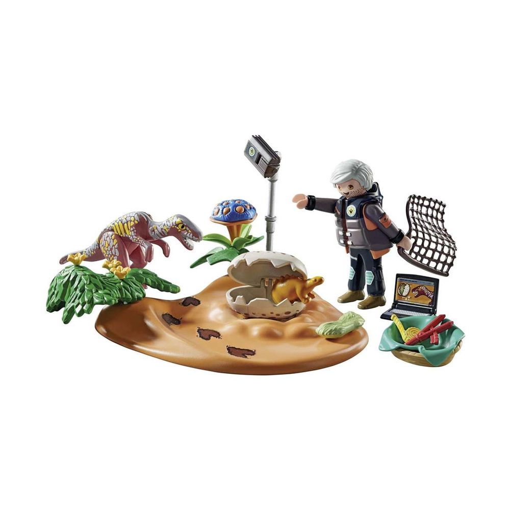 Καθώς ο ερευνητής των δεινοσαύρων εξετάζει ένα αυγό, ένας βελοσιράπτορας εμφανίζεται μπροστά του. Ωστόσο, ο δεινόσαυρος δεν υπολογίζει τον έξυπνο ερευνητή, ο οποίος τον διώχνει με ένα δίχτυ. Τώρα, ο μικρός στεγόσαυρος μπορεί να εκκολάψει ήρεμα από το αυγό του. Το σετ παιχνιδιού περιλαμβάνει μια φιγούρα Playmobil, έναν βελοσιράπτορα, ένα μωρό στεγόσαυρο, ένα ανοιγόμενο αυγό δεινοσαύρου, φορητό υπολογιστή, φωτογραφική μηχανή, καλάθι και πολλά άλλα συναρπαστικά αξεσουάρ.