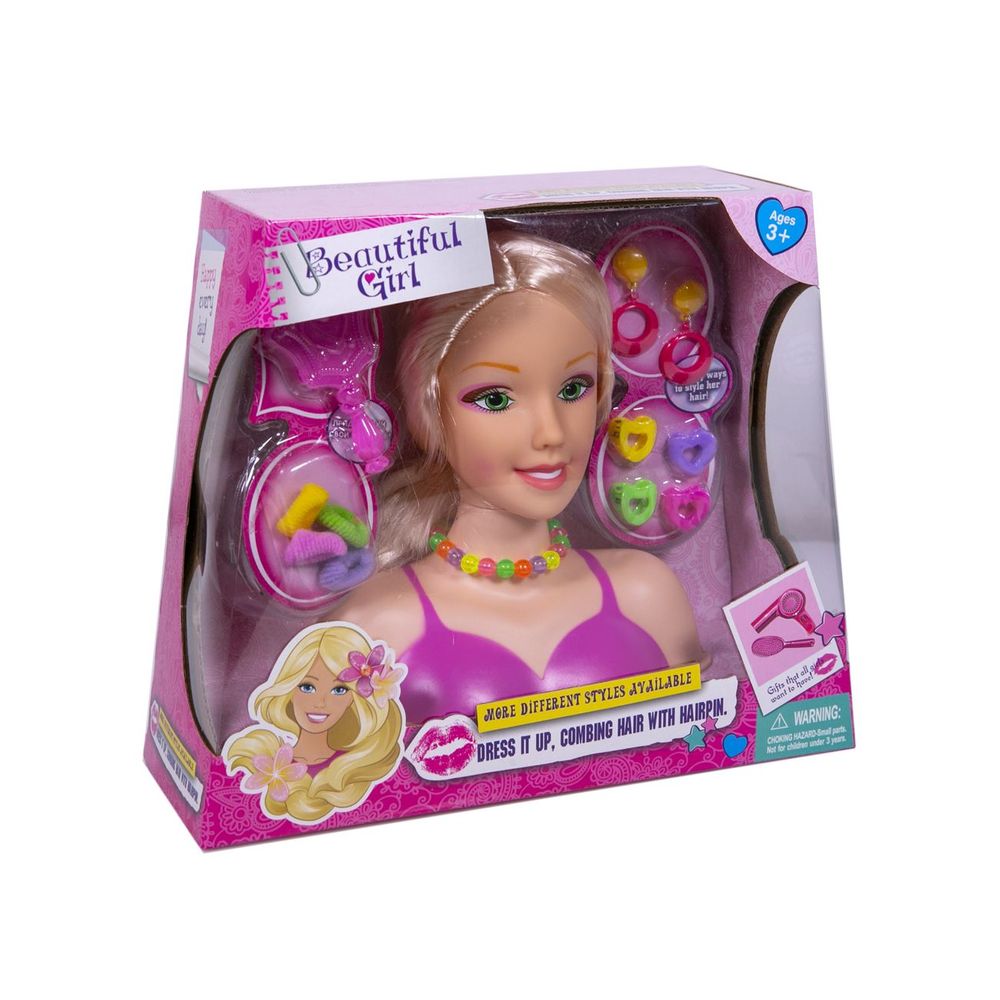 Κεφάλι ομορφιάς που περιλαμβάνει 1 ζευγάρι σκουλαρίκια, 1 κολιέ , 1 βούρτσα για μαλλιά, 4 κλάμερ και 4 λαστιχάκια. Μεταμόρφωσέ την σε πριγκίπισσα!