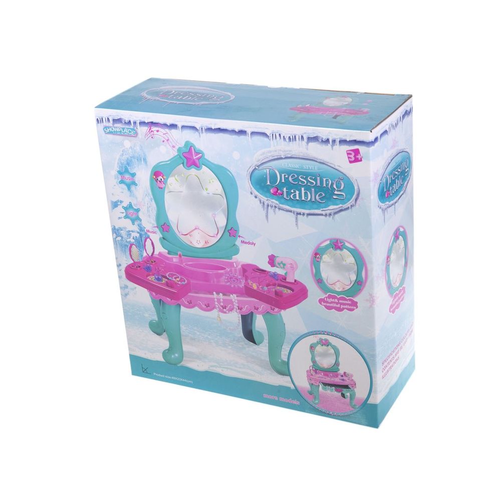 Τουαλέτα ομορφιάς με καθρέφτη που διαθέτει λειτουργίες φωτισμού και μουσικής. Η συσκευασία περιλαμβάνει επίσης και διάφορα αξεσουάρ όπως σεσουάρ μαλλιών, χτένα, βούρτσα καθώς και κοσμήματα και καλλυντικά.