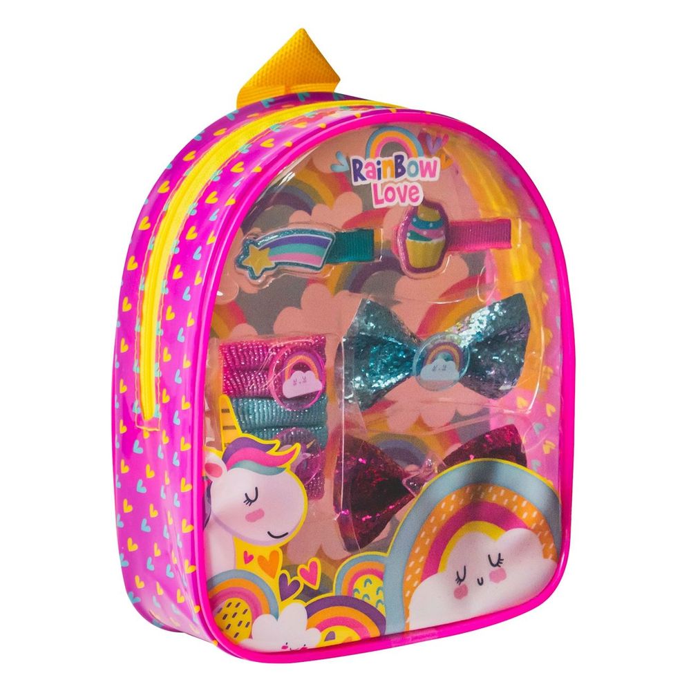 Τσαντάκι backpack με αξεσουάρ με σχέδια Rainbow Love. Με φιόγκους, λαστιχάκια και κλιπς για τα μαλλια για να ετοιμαστείς για μία έξοδο με τις φίλες σου!
