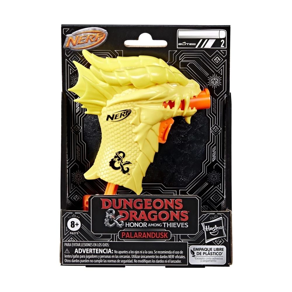 Το Nerf MicroShots Dungeons and Dragons είναι εμπνευσμένο από τον χρυσό δράκο Palarandusk, τον προστάτη της πόλης του Neverwinter στα Forgotten Realms της D&D. Τοποθέτησε ένα βελάκι στο μπροστινό μέρος του εκτοξευτή, τράβηξε προς τα κάτω τη λαβή για να εκτοξεύσεις το βελάκι. Περιλαμβάνει 2 βελάκια αφρού Nerf Elite.