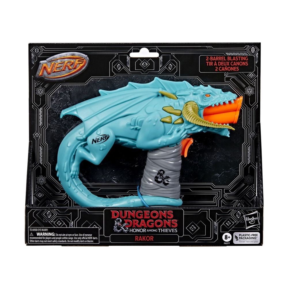 Το Nerf Dungeons & Dragons είναι εμπνευσμένο από τον μαύρο δράκο Rakor, ο οποίος απελευθερώνει όξινη πνοή σε κάθε τυχοδιώκτη στα Ξεχασμένα Βασίλεια που τολμά να τον αμφισβητήσει για να διεκδικήσει τον θησαυρό του. Τοποθέτησε 2 βελάκια μπροστά στον εκτοξευτή, τράβηξε τη λαβή εκκίνησης και εκτόξευσε 1 βελάκι . Περιλαμβάνει 4 βελάκια από αφρό Nerf Elite.