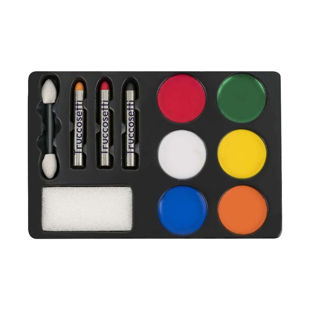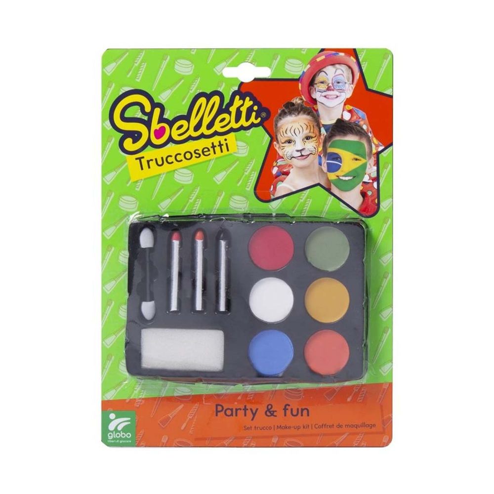Η Truccosetti είναι η τελεια επιλογη για το πάρτυ. Το σετ περιλαμβάνει 3 κραγιόνια, 6 θέσεις με κρεμώδη σκιά, ένα πινελάκι και ένα σφουγγαράκι εφαρμογής. Δοκιμασμένα και ασφαλή προϊόντα μακιγιάζ Sbelletti, πλένονται με νερό.