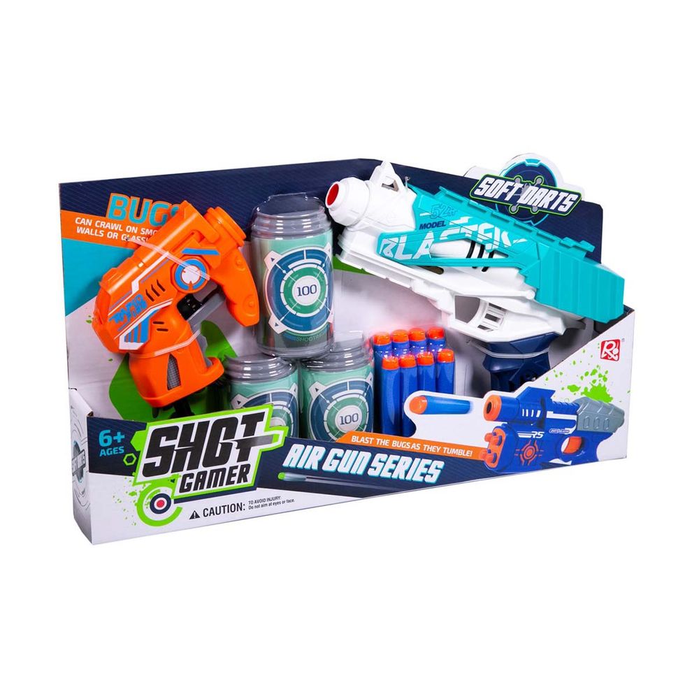 Σετ όπλο-εκτοξευτής με δύο όπλα, 23.5cm και 11.4cm, 8 αφρώδη βελάκια και 3 στόχους τενεκεδάκια για να εξασκήσεις το σημάδι σου και να διασκεδάσεις με τους φίλους σου. Διπλός εκτοξευτής, διπλή διασκέδαση.