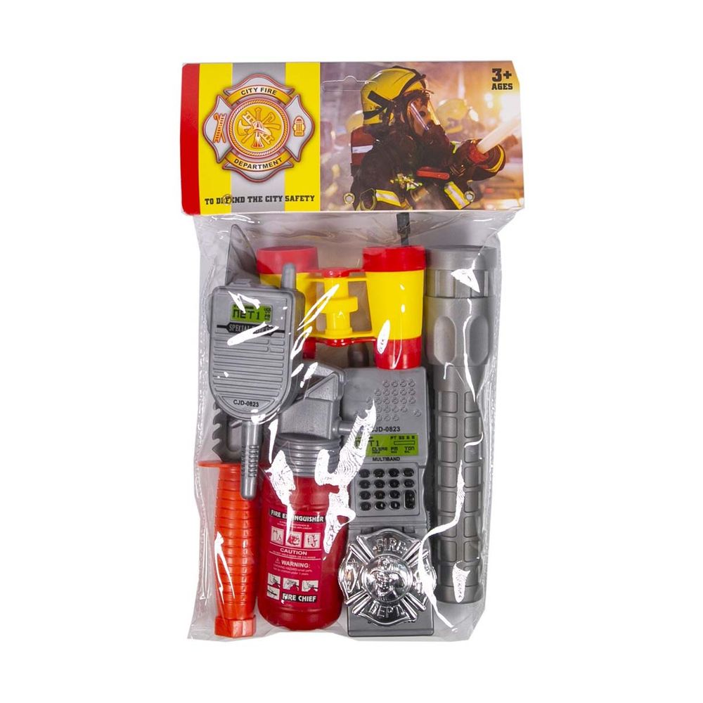 Τώρα είσαι και εσύ ένας δυνατός πυροσβέστης έτοιμος να ενταπεξέλθεις σε κάθε περίσταση με αυτό το σετ που περιλαμβάνει πυροσβεστήρα, φακό, κιάλια, μαχαίρι, ασύρματο, τηλέφωνο και σήμα. Διαστάσεις συσκευασίας Μ:18 x Υ:31εκ.\n Κατάλληλο για παιδιά ηλικίας 3+.
