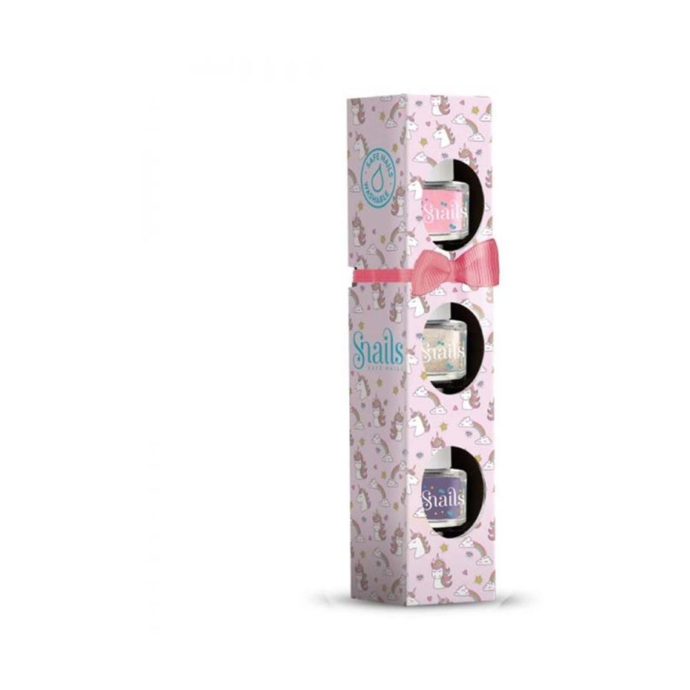 Το mini Snails Unicorn 3 pack είναι το νέο πακέτο δώρου τριών τεμαχίων, φτιαγμένο από τα χρώματα των παραμυθιών και του ουράνιου τόξου. Αυτά τα χρώματα σε ταξιδεύουν σε ένα παραμυθένιο κόσμο γεμάτο πανέμορφους μονόκερους. Προσφέρουν μια διακριτική εμφάνιση που είναι ιδανική για τα μικρότερα παιδιά. Το ροζ φιογκάκι μπορεί να χρησιμοποιηθεί ως βραχιόλι. Αυτό το πακέτο περιέχει 3 παιδικά βερνίκια νυχιών Snails των 7ml (Ariel, Baby Cloud & Hope ).