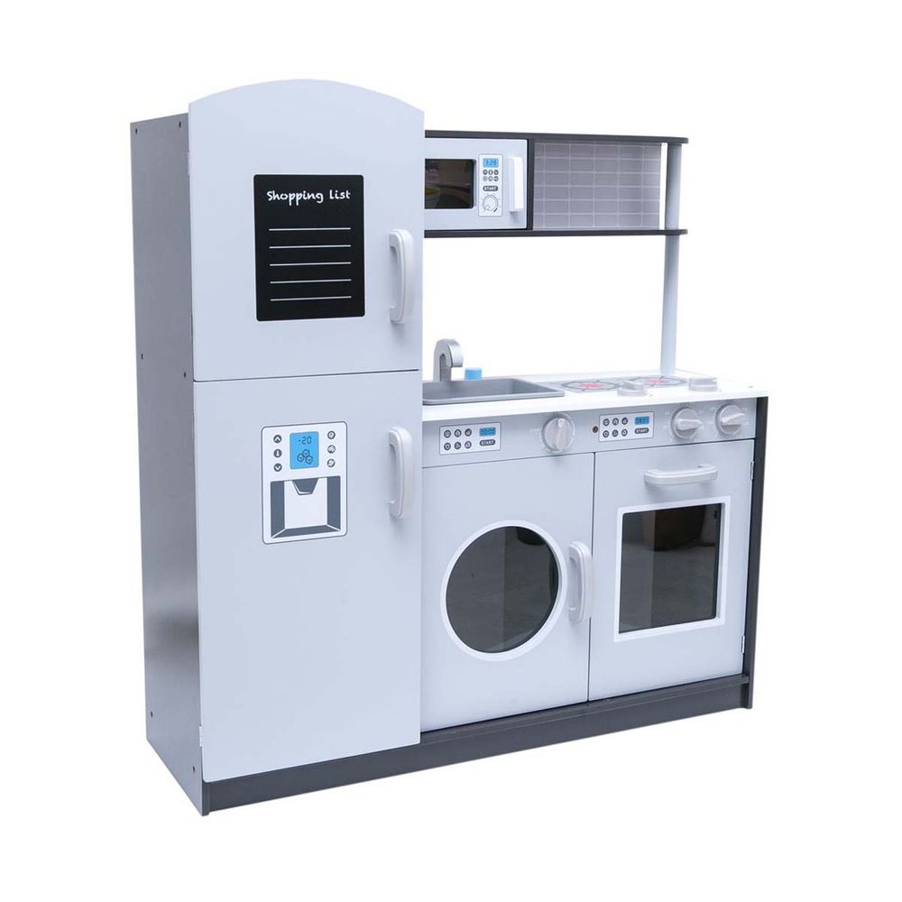 Ξύλινη μοντέρνα κουζίνα με πλυντήριο, για να επιπλώσεις υπέροχα το δωμάτιό σου! Αυτή η μοναδική γκρι κουζίνα περιλαμβάνει μεγάλο πάγκο, ψυγειοκαταψύκτη, πλυντήριο με διακόπτη λειτουργίας, φούρνο με 2 διακόπτες, μαγειρικές εστίες με 2 διακόπτες, νεροχύτη, φούρνο μικροκυμάτων και ράφια για τα τρόφιμά σου (δεν περιλαμβάνονται). Με οδηγίες συναρμολόγησης.