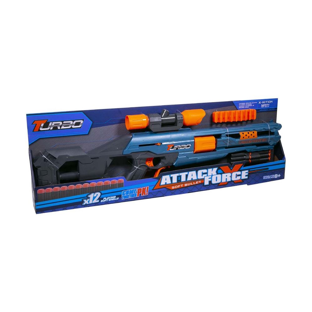 Όπλοεκτοξευτής Turbo, με 12 βελάκια. Πυροβόλο μήκους 75 cm. με διόπτρα για μεγαλύτερη ευκρίνεια στόχου. Είναι παράλληλα και εκτοξευτής μεγάλης απόστασης με 12 αφρώδη βελάκια για να διπλασιάσεις τη διασκέδασή σου.