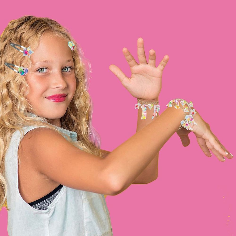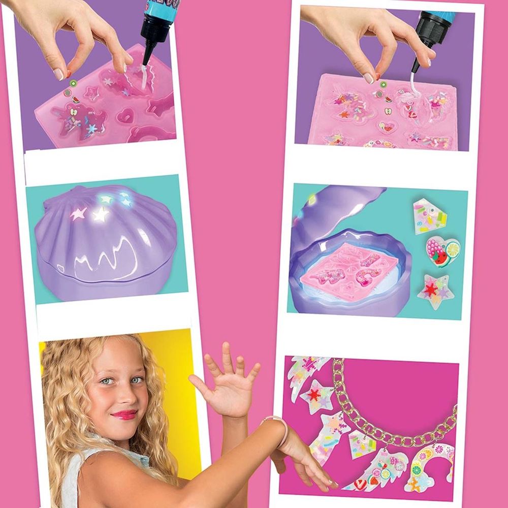 Το Εργαστήριο Κοσμημάτων Magic Shell μετατρέπει το gel σε κοσμήματα μέσα σε λίγα λεπτά! Ρίξε λίγη ποσότητα από το υγρό στο καλούπι και πρόσθεσε διακοσμητικά. Στη συνέχεια, τοποθέτησε το δίσκο του καλουπιού μέσα στο κοχύλι και άναψε το φως. Με UV ακτινοβολία, το gel θα γίνει κόσμημα σε μόλις 3 λεπτά! Τώρα μπορείς να βγάλεις τα κοσμήματα σου από το καλούπι και να τους μετατρέψεις σε αξεσουάρ που μπορείς να φορέσεις.