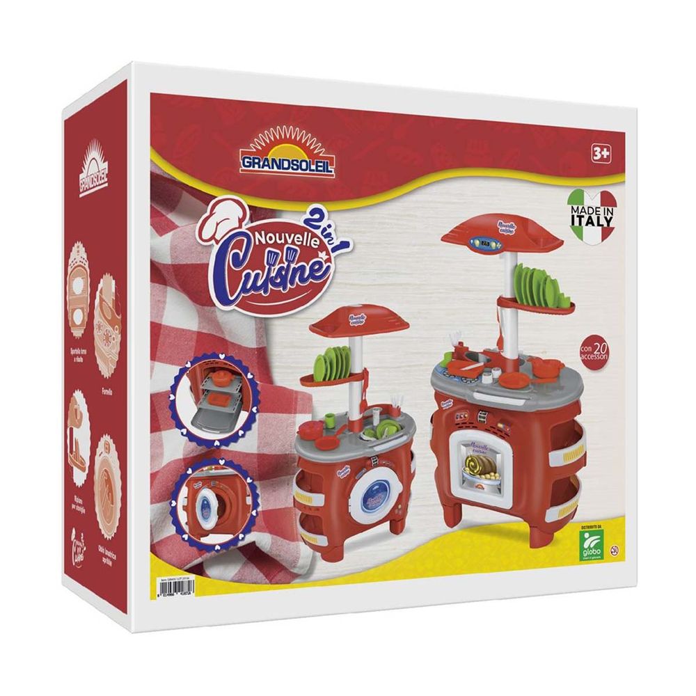 Η κουζίνα της Grandsoleil είναι διακοσμημένη με πολλές λεπτομέρειες για να ανακαλύψεις και να διασκεδάσεις. Από τη μια πλευρά έχει μεγάλο πάγκο με νεροχύτη, σχάρα πιάτων και πλυντήριο ρούχων με άνοιγμα, από την άλλη πλευρά διαθέτει εστία, σχάρα μαχαιροπήρουνων και φούρνο με 2 αφαιρούμενες σχάρες. Στα πλαϊνά διαθέτει 4 ευρύχωρες θήκες για την αποθήκευση των 20 αξεσουάρ που περιλαμβάνονται.